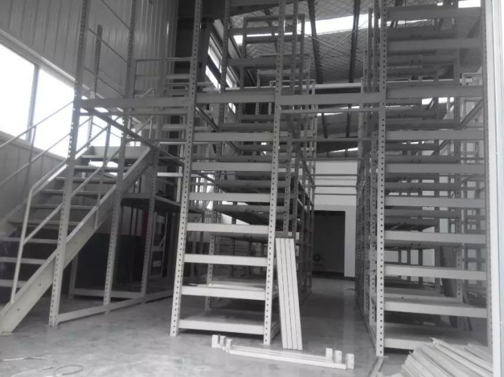 5、下層是貨架形式,上層可以是平臺(tái)也可以是貨架的結(jié)構(gòu)。底層貨架既可以存儲(chǔ)物料又是樓面的支撐,極具靈活性。